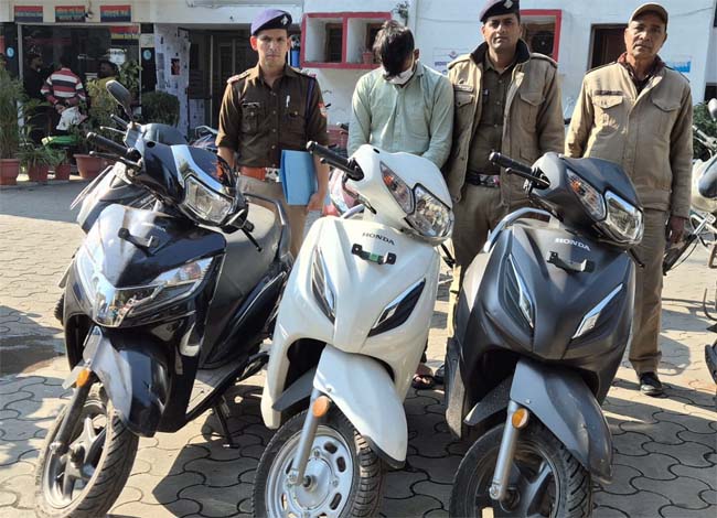 हल्द्वानी। एसएसपी नैनीताल के निर्देशन में नैनीताल पुलिस ने स्कूटी चोरी की घटनाओं का सफल खुलासा करते हुए एक शातिर चोर को गिरफ्तार किया है। पुलिस ने आरोपी के कब्जे से चोरी की गई तीन स्कूटी एक्टिवा भी बरामद की हैं।