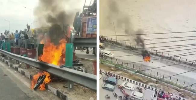 दूसरी घटना सोमवार शाम को केबल पुल पर घटी, जब एक कांवड़िए की चलती बाइक में अचानक आग लग गई। कुछ ही पलों में बाइक आग का गोला बन गई। घटना के तुरंत बाद मौके पर मौजूद पुलिस ने सतर्कता दिखाते हुए दोनों ओर का ट्रैफिक रोक दिया, जिससे किसी भी प्रकार की भीड़भाड़ या अफरा-तफरी नहीं मची।